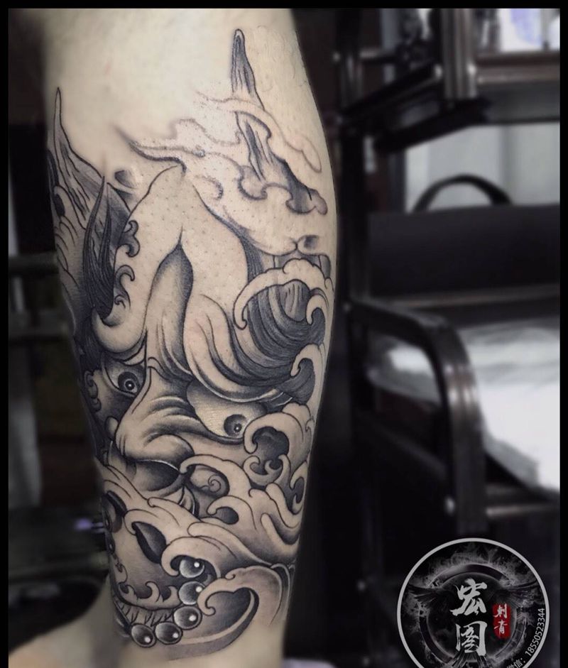 • T网红王老大花腿龙纹身图片_腿部新传统纹身图案