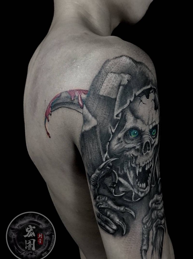死神纹身图片_成品肩部手臂欧美写实鬼神人物宗教纹身图案