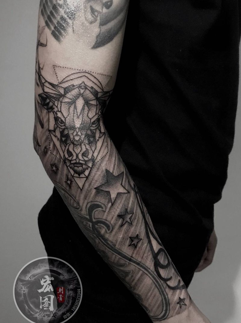 花臂进行中纹身图片_成品手臂手部欧美清新贴纸几何字符动物原创纹身图案