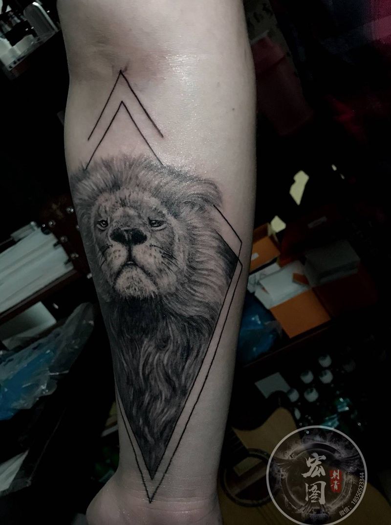 傲娇的狮子纹身图片_手臂手部欧美写实几何纹身图案