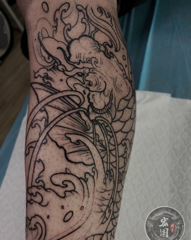 • T网红王老大花腿龙纹身图片_腿部新传统纹身图案