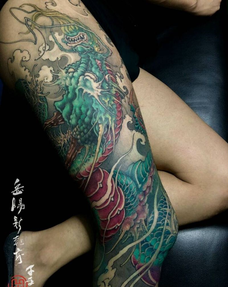 • T网红王老大花腿龙纹身图片_腿部新传统纹身图案