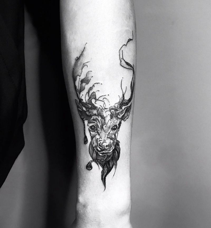 当前位置: 首页 >湖南省常德市纹身店-甲由刺青纹身图案>遮盖鹿头纹身图片_手臂点刺水彩纹身图案