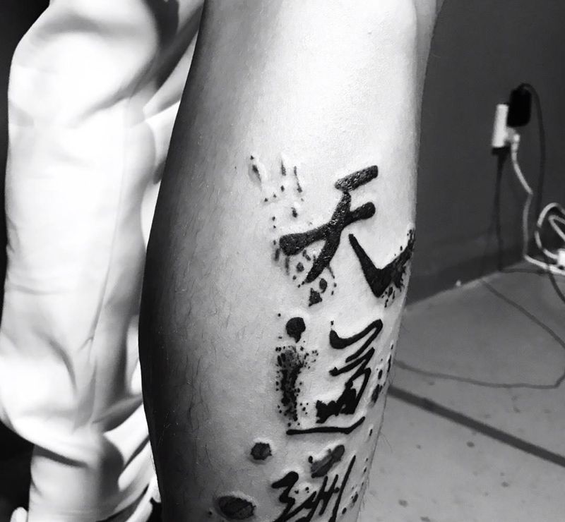 天道酬勤纹身图片_腿部水墨纹身图案