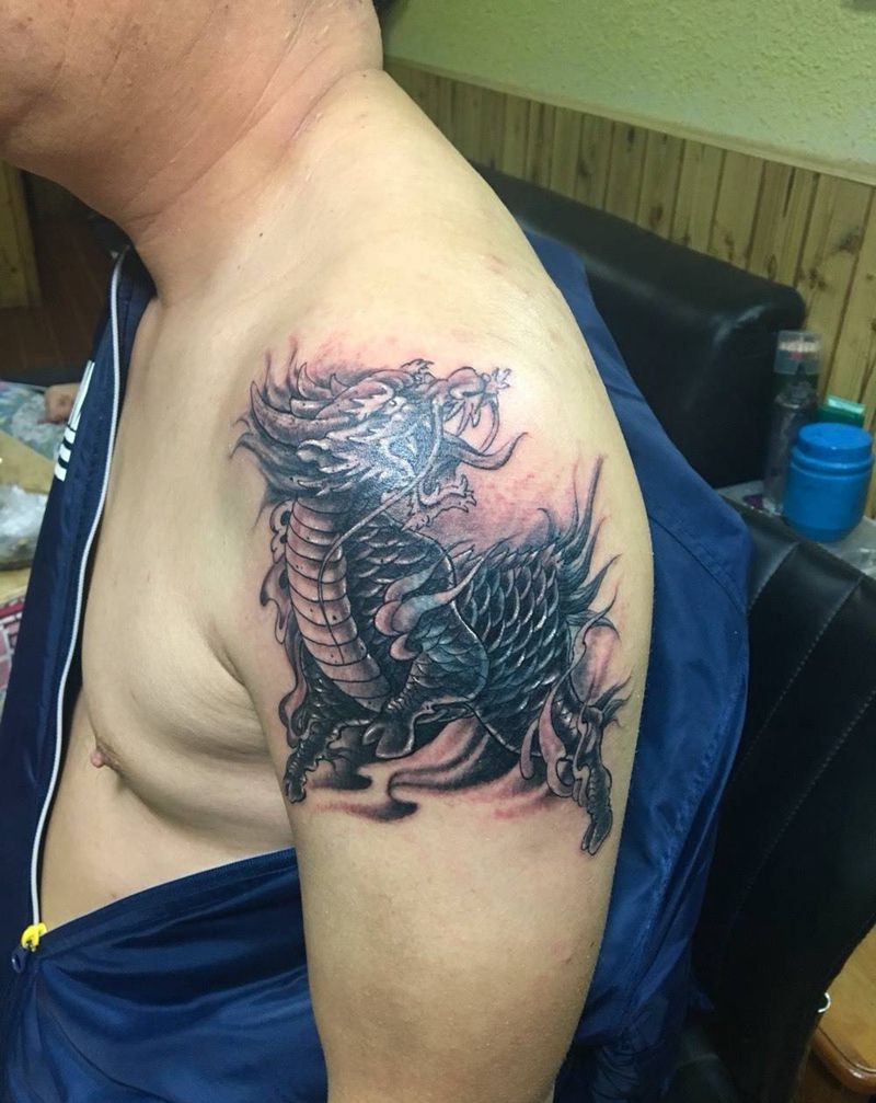 • T网红王老大花腿龙纹身图片_腿部新传统纹身图案