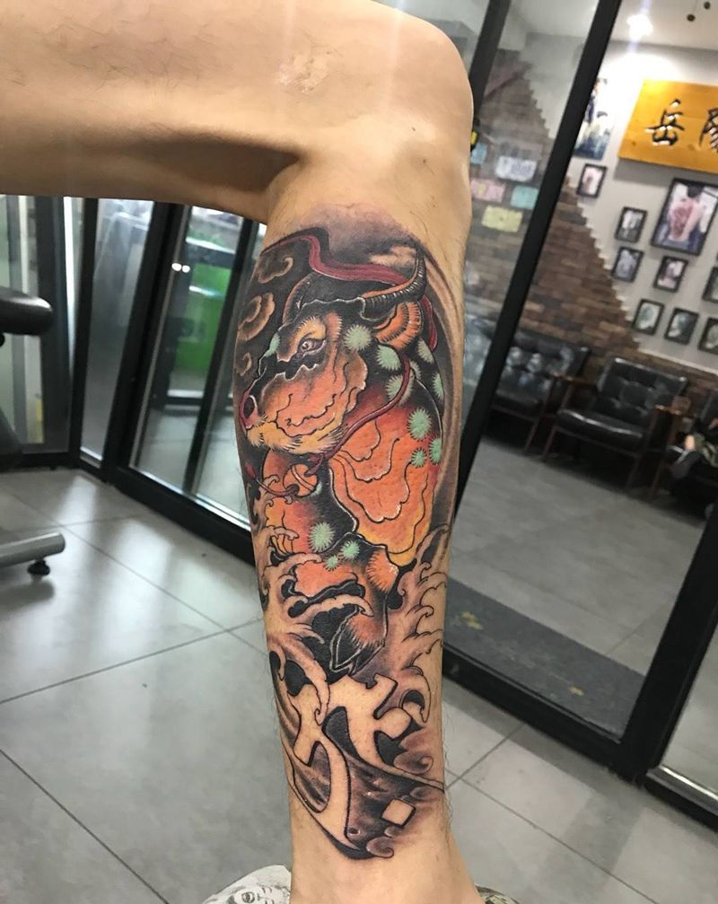 当前位置: 首页 >湖南省岳阳市纹身店-忠义堂刺青私人定制纹身图案>生肖牛与守护神纹身图片