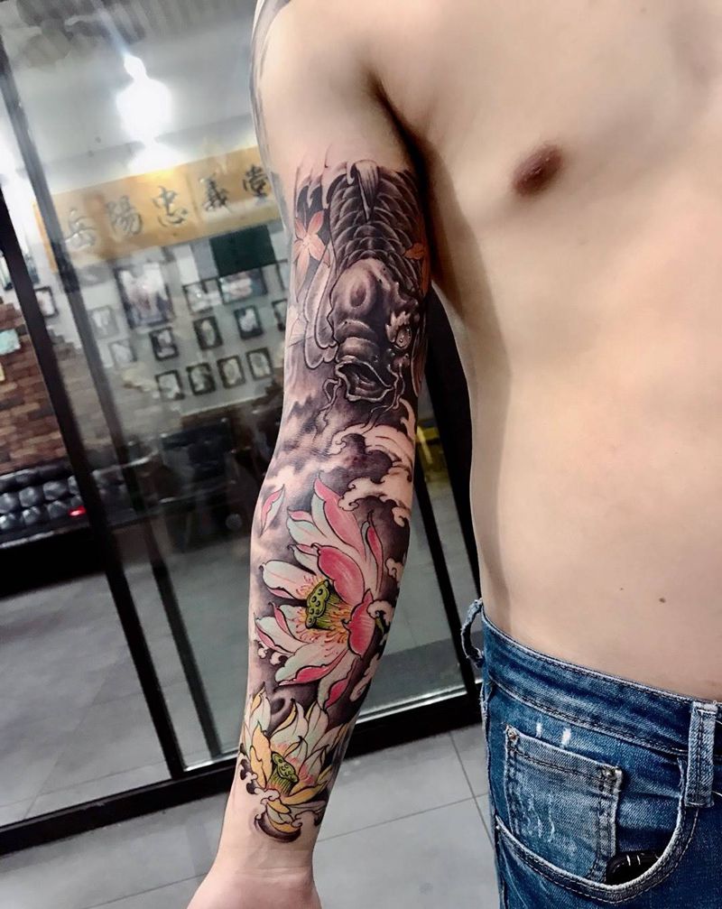 当前位置: 首页 >湖南省岳阳市纹身店-忠义堂刺青私人定制纹身图案>彩色莲花。花臂添加。纹身图片