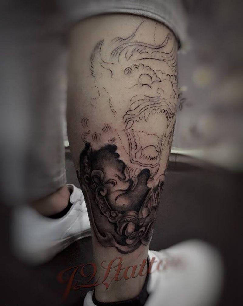 • T网红王老大花腿龙纹身图片_腿部新传统纹身图案