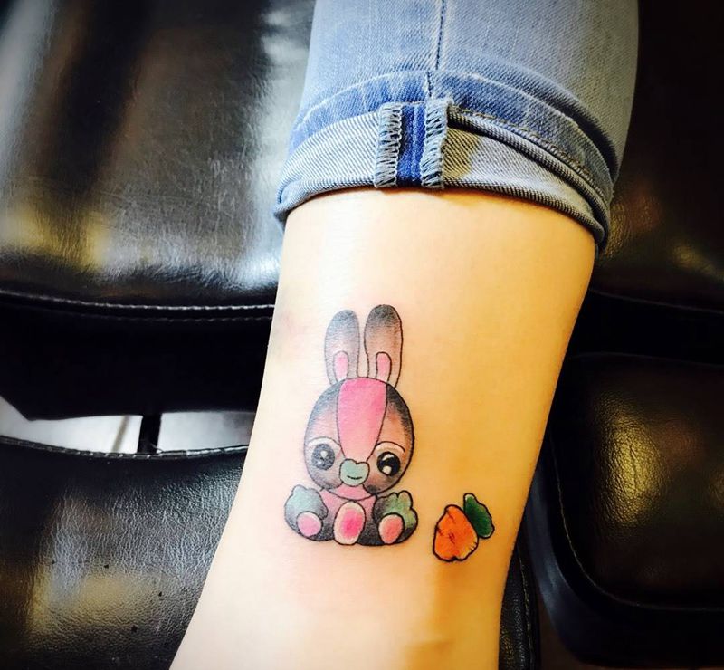 兔子与胡萝卜纹身图片_成品脚部腿部清新动物植物静物纹身图案
