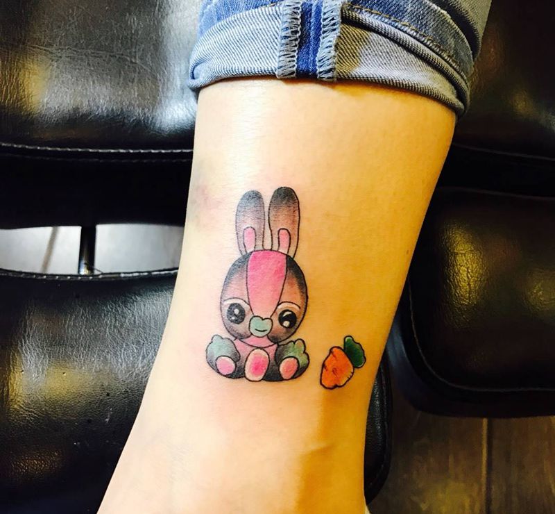 兔子与胡萝卜纹身图片_成品脚部腿部清新动物植物静物纹身图案