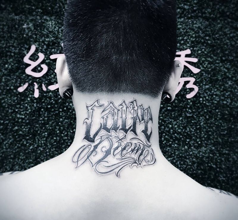 其卡洛字体纹身图片_成品颈部肩部欧美字符静物纹身图案