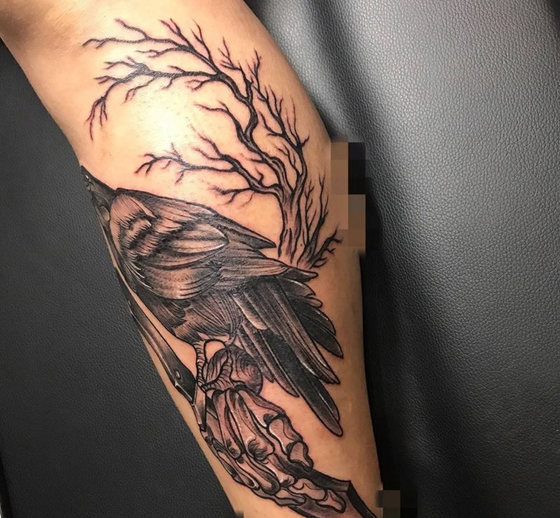 当前位置: 首页 >湖南省常德市纹身店-立子屋刺青纹身图案>乌鸦纹身图片_成品腿部欧美动物植物纹身图案