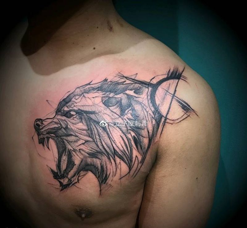 速写狼纹身图片_胸部纹身图案