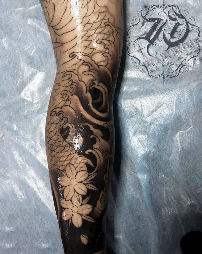 • T网红王老大花腿龙纹身图片_腿部新传统纹身图案