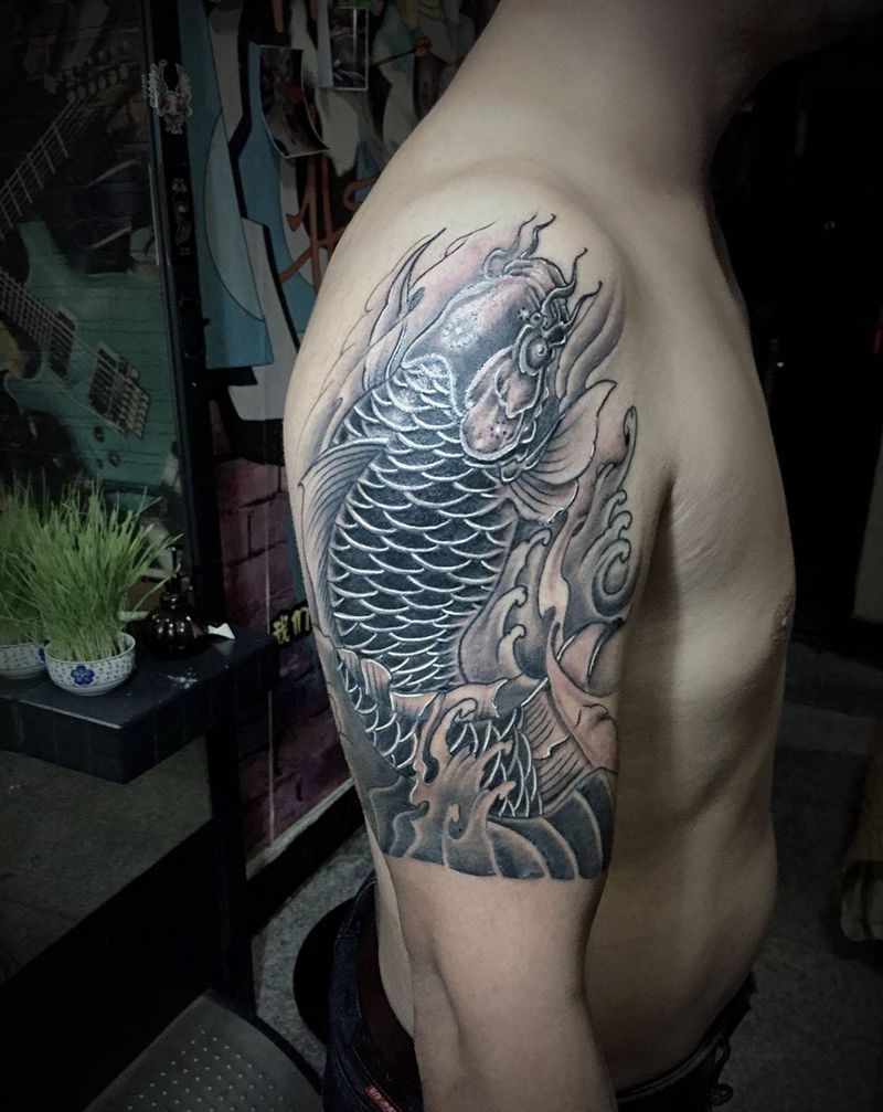 当前位置: 首页 >湖南省常德市纹身店-针谛刺青工作室纹身图案>遮盖图腾鲤鱼纹身图片