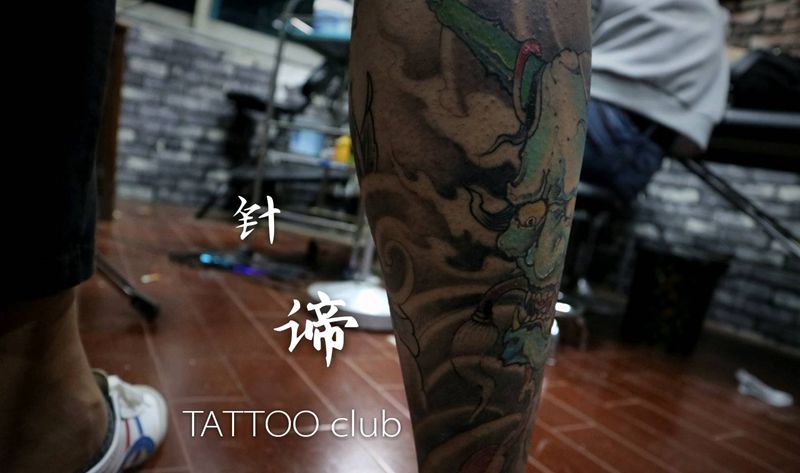 当前位置: 首页 >湖南省常德市纹身店-针谛刺青工作室纹身图案>新传统般若浪花包小腿纹身图片