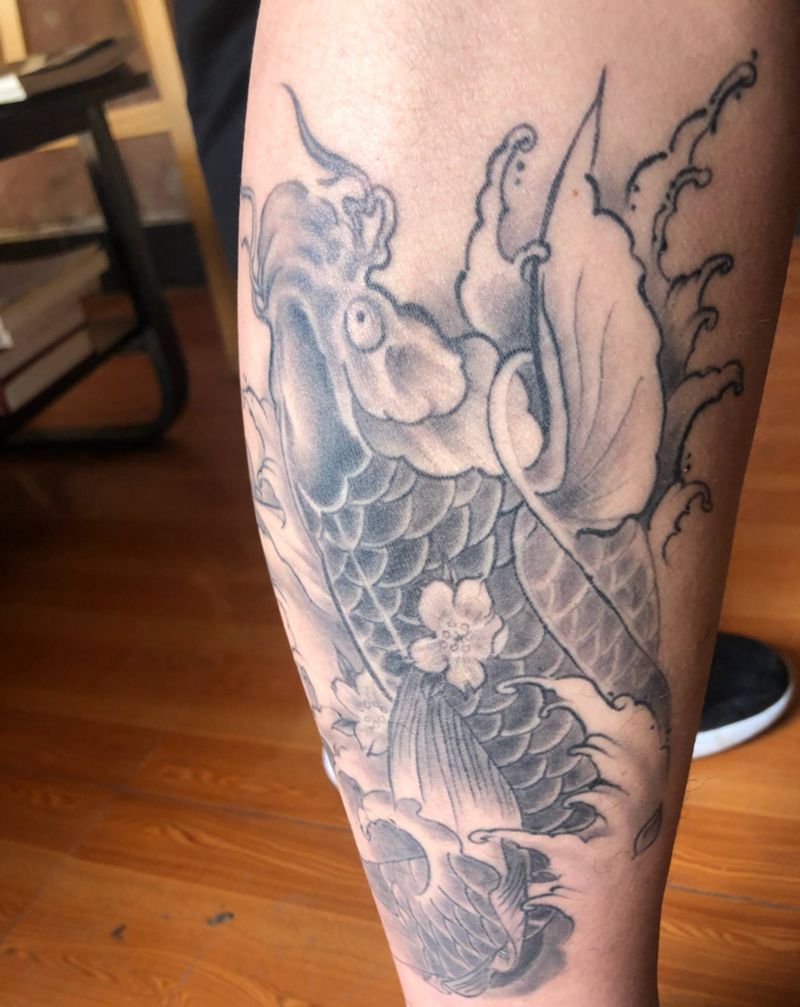 当前位置: 首页 >湖南省永州市纹身店-悟空纹身工作室纹身图案>鲤鱼小腿纹身图片