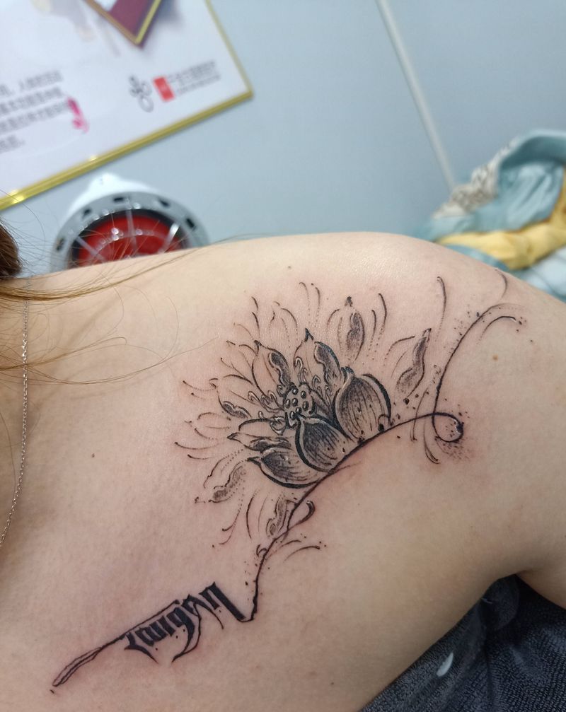 当前位置: 首页 >湖南省常德市纹身店-台湾刺青湖南店纹身图案>荷花➕梵文纹身图片_肩部纹身图案