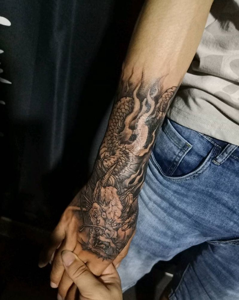 • T网红王老大花腿龙纹身图片_腿部新传统纹身图案