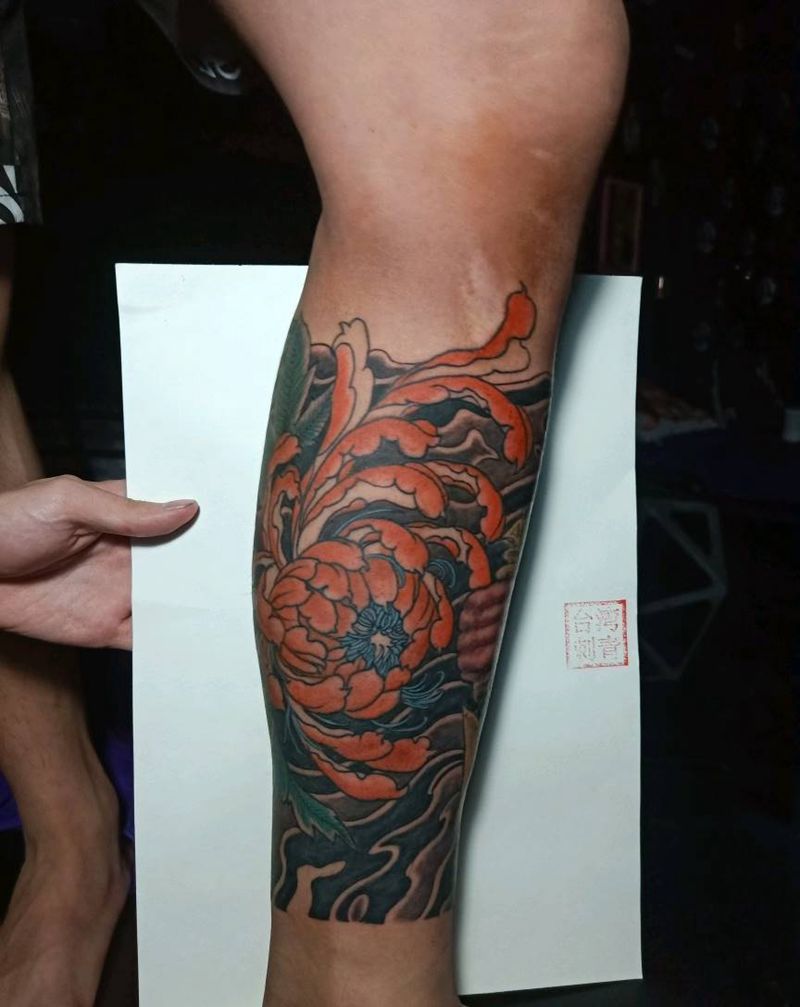 当前位置: 首页 >湖南省常德市纹身店-台湾刺青湖南店纹身图案>象神 菊花 包小腿纹身图片_腿部纹身图案
