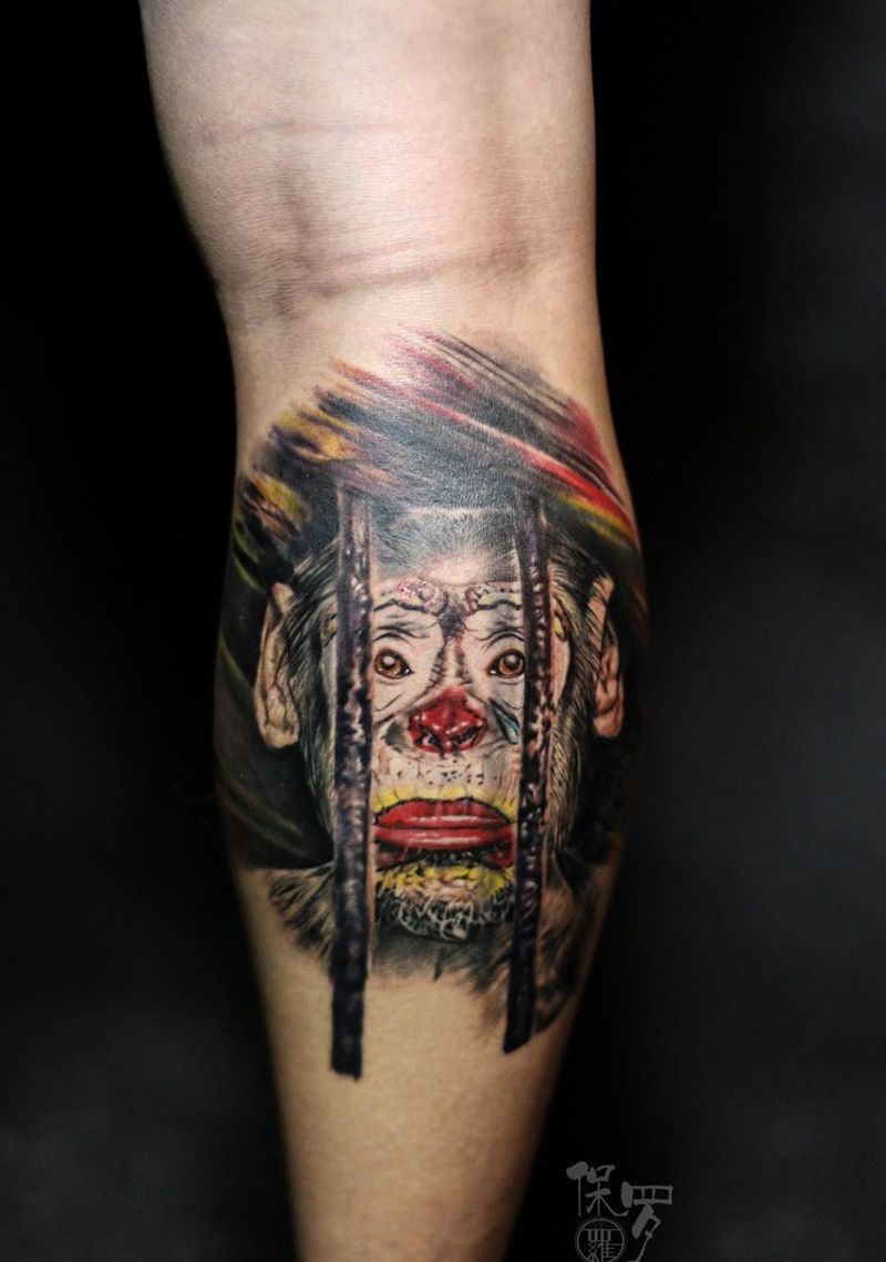 • T包小腿吹火男+阿多福纹身图片_腿部老传统新传统吹火男阿