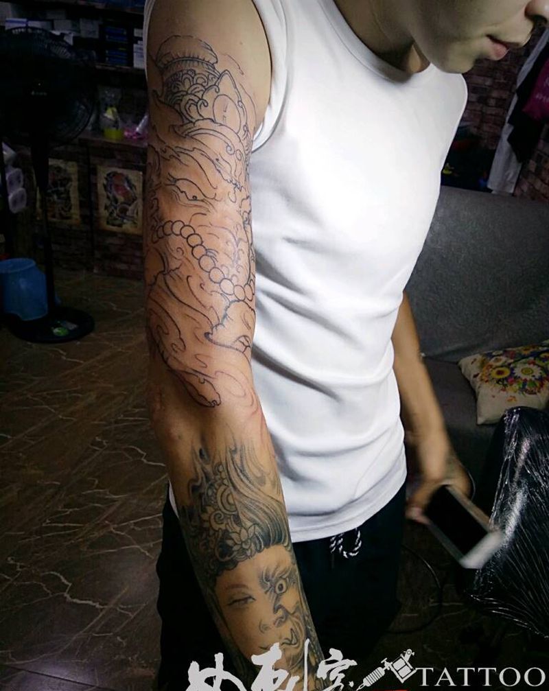 当前位置: 首页 >湖南省怀化市纹身店-湖南怀化女刺客纹刺部落纹身图案>花臂线条完工纹身图片