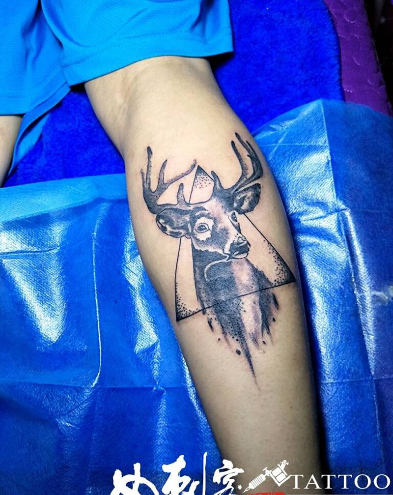 一鹿发纹身图片_腿部欧美动物成品纹身图案