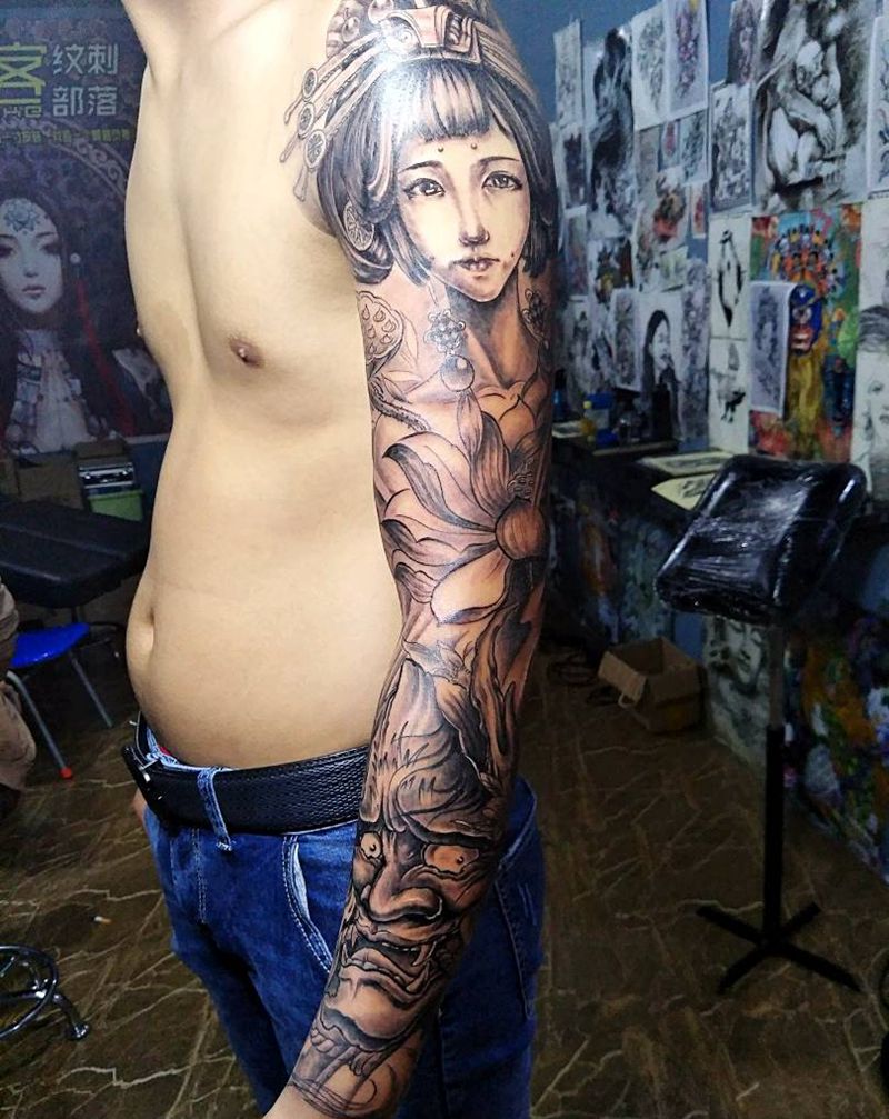 花臂纹身图片_手臂传统人物鬼神花臂纹身图案
