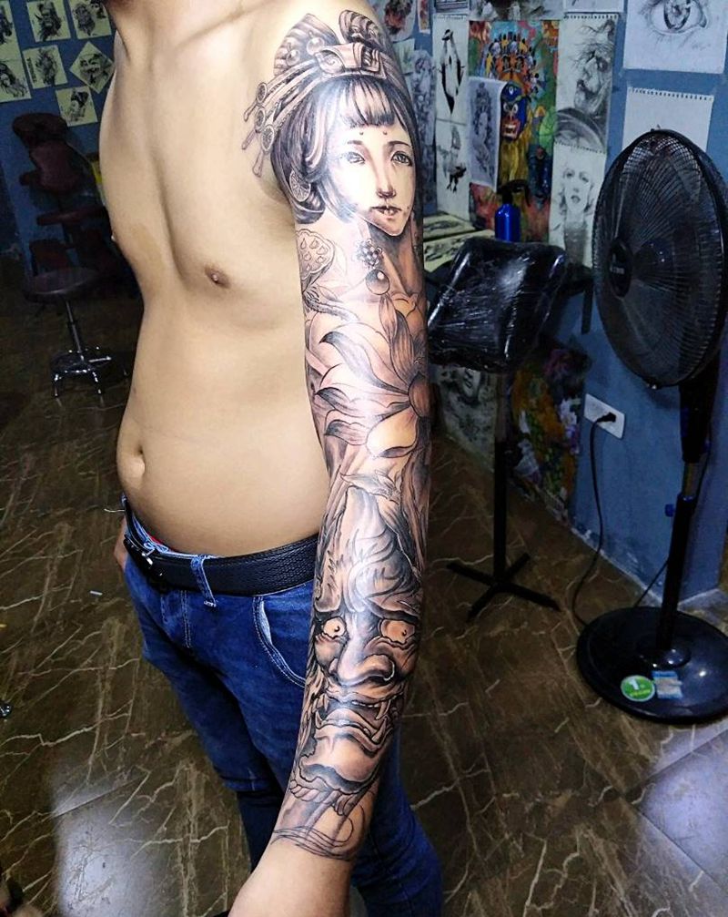 花臂纹身图片_手臂传统人物鬼神花臂纹身图案