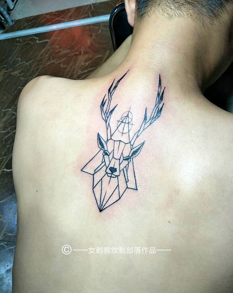 当前位置: 首页 >湖南省怀化市纹身店-湖南怀化女刺客纹刺部落纹身图案>鹿纹身图片_背部清新几何动物纹身图案