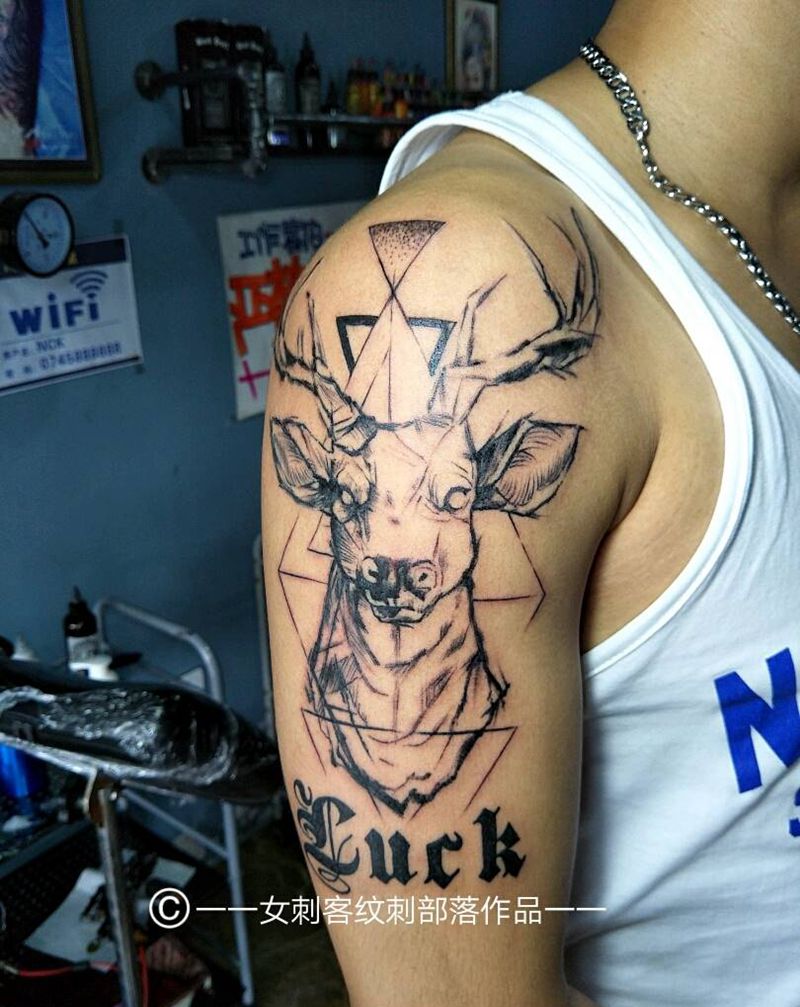 当前位置: 首页 >湖南省怀化市纹身店-湖南怀化女刺客纹刺部落纹身图案>鹿纹身图片_手臂欧美字符动物素描纹身图案