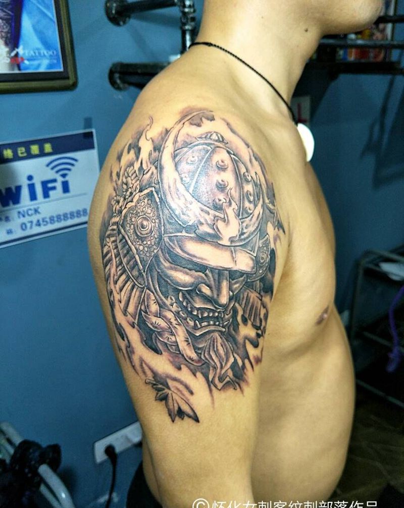 当前位置: 首页 >湖南省怀化市纹身店-湖南怀化女刺客纹刺部落纹身图案>鬼武士纹身图片_手臂传统鬼神纹身图案