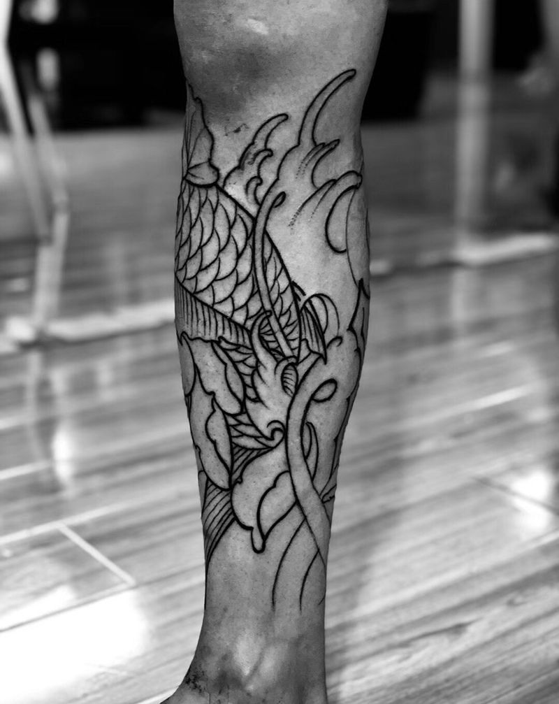 • T网红王老大花腿龙纹身图片_腿部新传统纹身图案