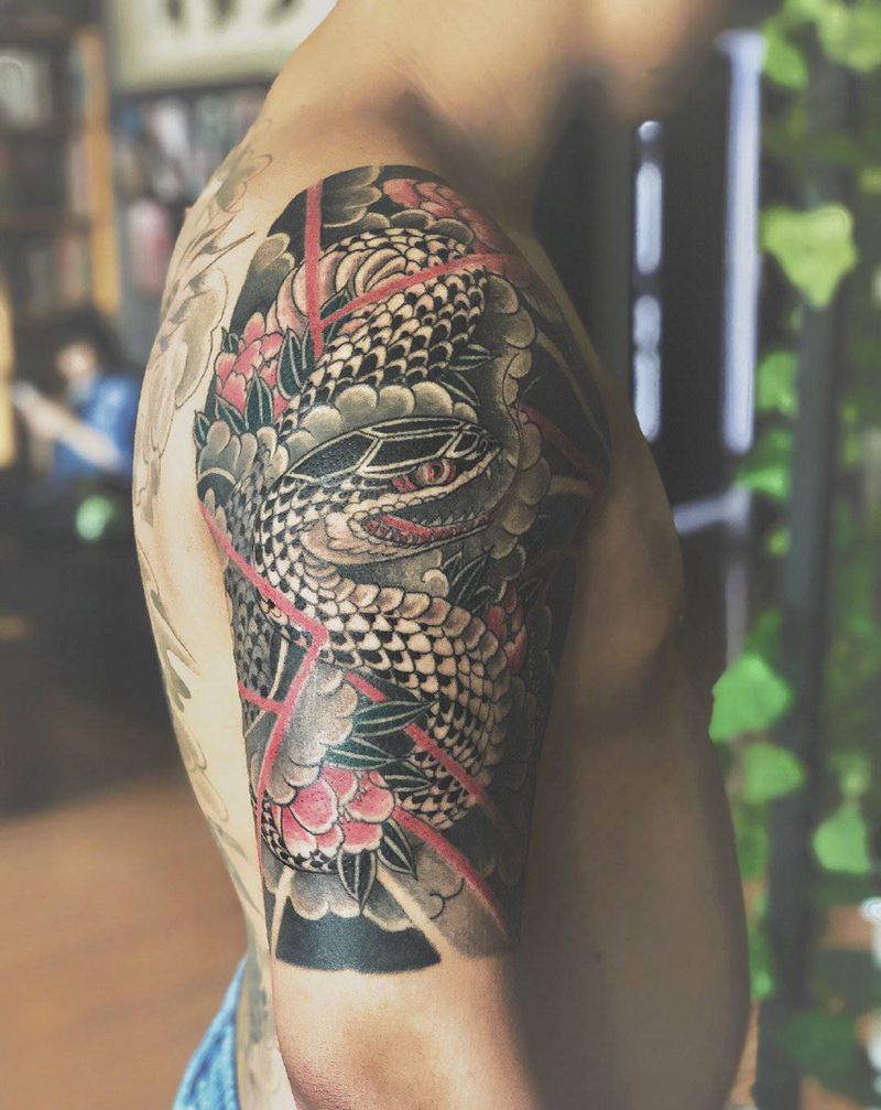 • T网红王老大花腿龙纹身图片_腿部新传统纹身图案
