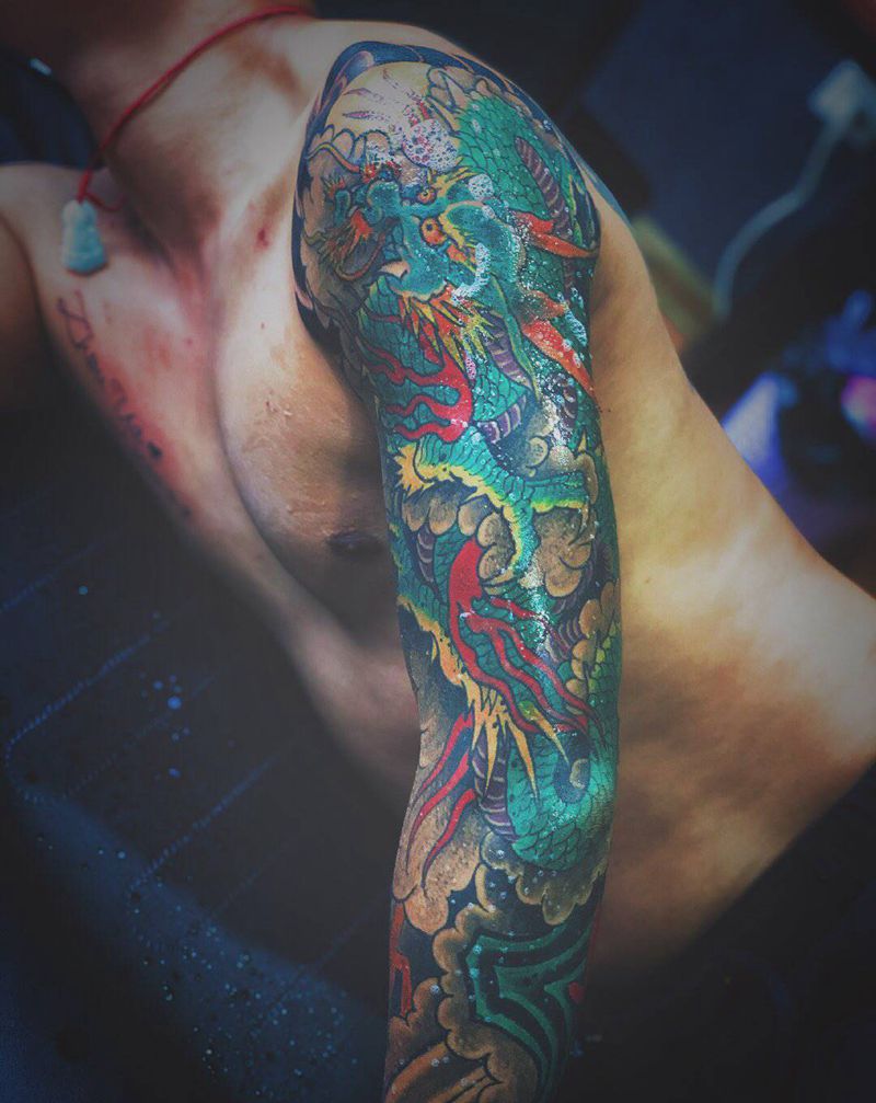 • T网红王老大花腿龙纹身图片_腿部新传统纹身图案