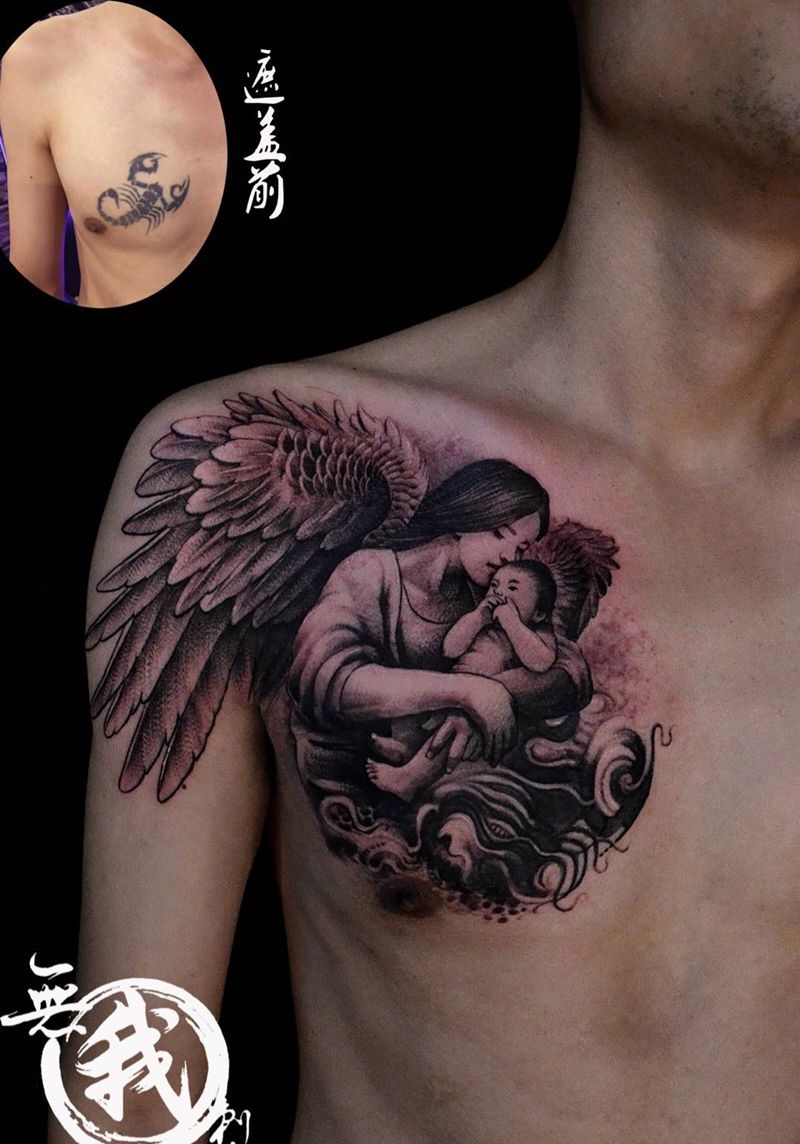 天使 【遮盖】纹身图片_原创欧美写实成品手稿背部胸部肩部人物宗教纹身图案