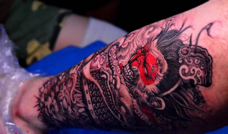 当前位置: 首页 >广东省广州市纹身店-广州纹身無我刺青tattoo纹身图案>悟空纹身图片_成品手稿插画腿部脚部人物鬼神原创纹身图案