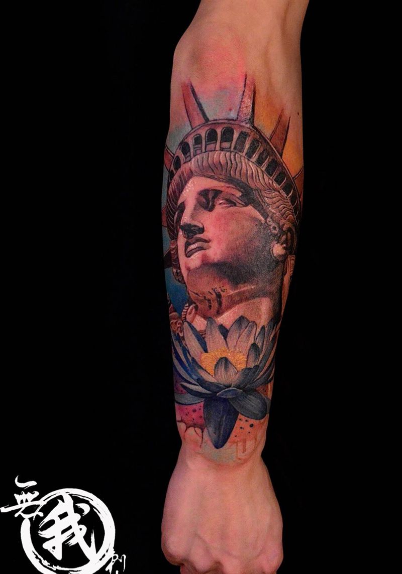 当前位置: 首页 >广东省广州市纹身店-广州纹身無我刺青tattoo纹身图案>自由女神纹身图片_成品手稿手部手臂欧美人物宗教纹身图案