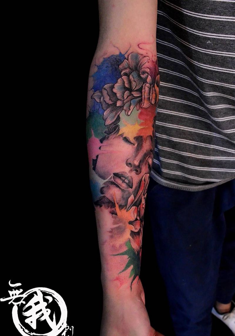 当前位置: 首页 >广东省广州市纹身店-广州纹身無我刺青tattoo纹身图案>泼墨风混彩纹身图片_人物植物欧美肖像写实清新手部手臂纹身图案