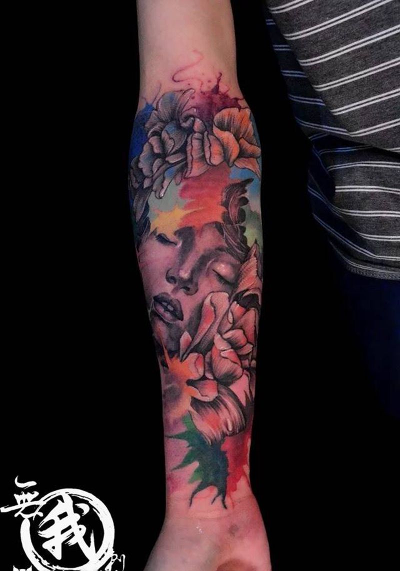 当前位置: 首页 >广东省广州市纹身店-广州纹身無我刺青tattoo纹身图案>泼墨风混彩纹身图片_人物植物欧美肖像写实清新手部手臂纹身图案