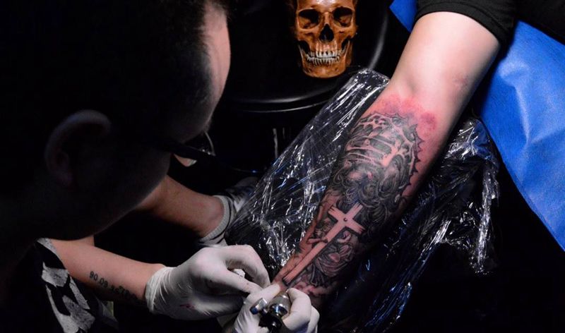 当前位置: 首页 >广东省广州市纹身店-广州纹身無我刺青tattoo纹身图案>耶稣纹身图片_欧美肖像写实成品手稿手部手臂人物鬼神宗教纹身图案
