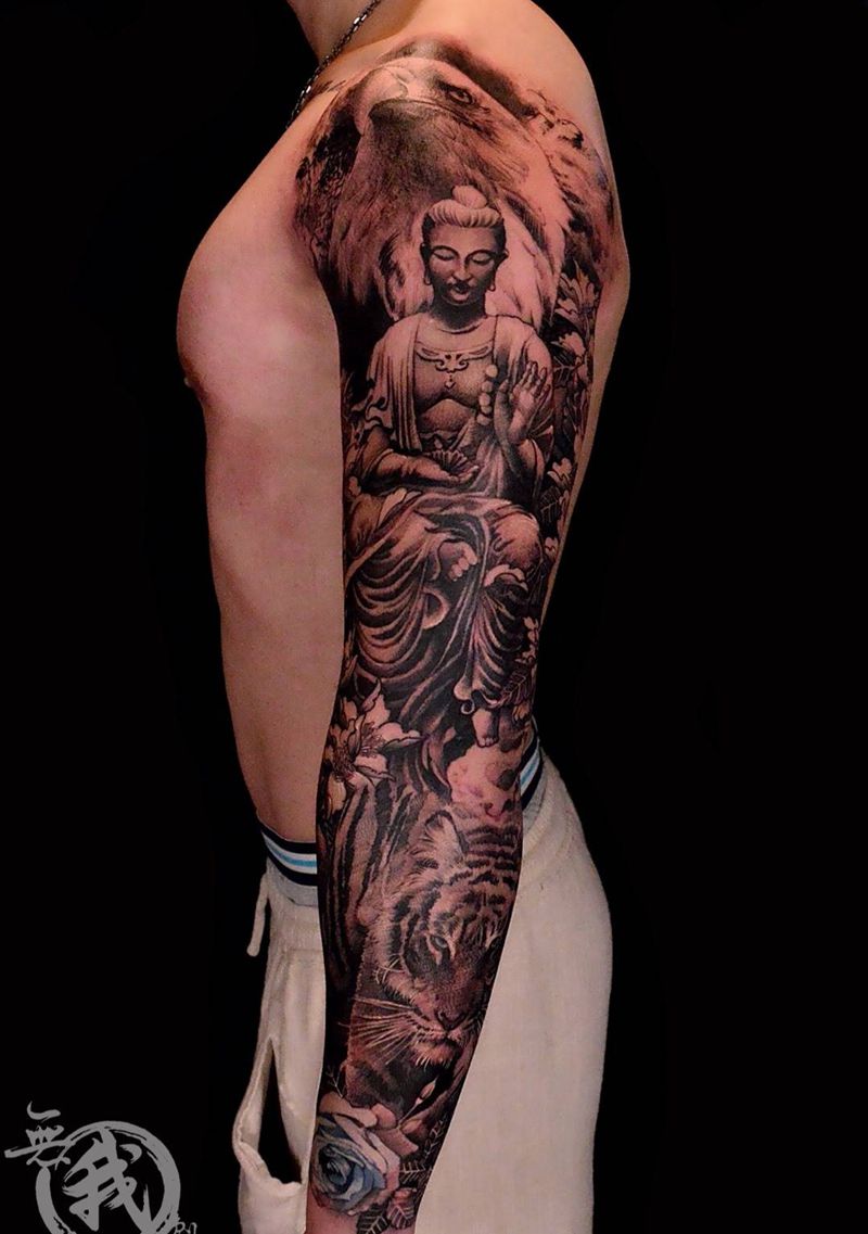 当前位置: 首页 >广东省广州市纹身店-广州纹身無我刺青tattoo纹身图案>花臂纹身图片_成品手稿手臂欧美写实肖像人物宗教动物原创纹身图案