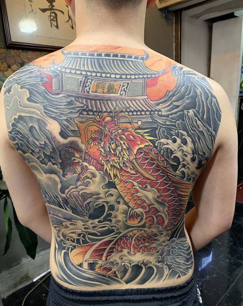 鲤鱼跃龙门纹身图片_背部新传统老传统纹身图案