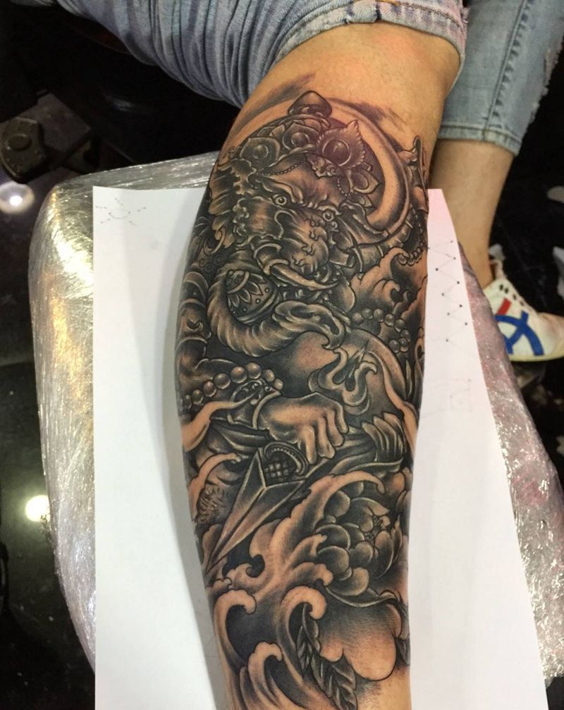 • T网红王老大花腿龙纹身图片_腿部新传统纹身图案