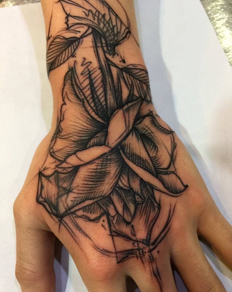 • 手背潮流时尚的玫瑰花眼睛纹身图案