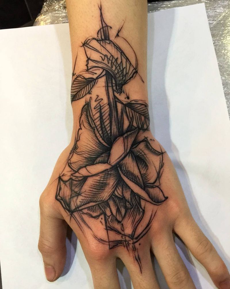 • 手背潮流时尚的玫瑰花眼睛纹身图案