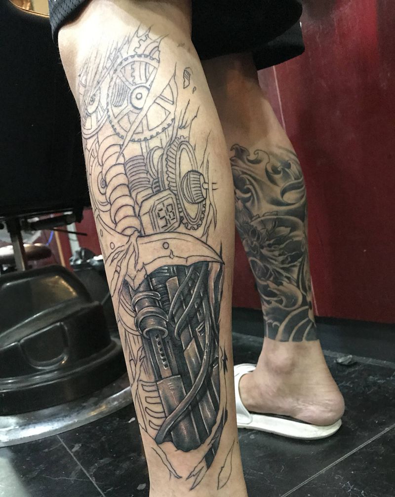 当前位置: 首页 >广东省广州市纹身店-广州红墨坊纹艺纹身图案>机械 半成品纹身图片_腿部纹身图案