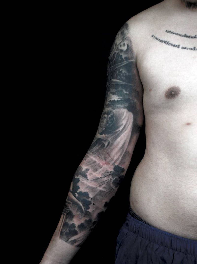 当前位置: 首页 >广东省广州市纹身店-黑火堂纹身纹身图案>自由女神场景花臂纹身图片