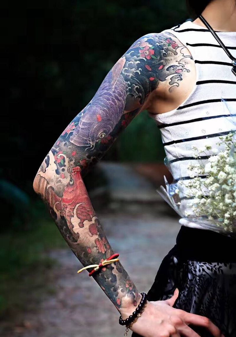 美女花臂纹身图片_成品手臂手部脚部腿部欧美传统国画鬼神遮盖纹身图案