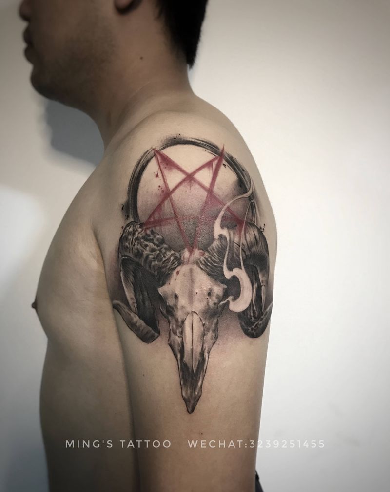 羊骷髅纹身图片_手臂欧美写实羊骷髅纹身图案